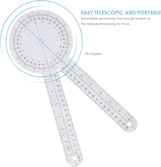 - 【Evaluate Range of Motion】outlet's 3 pieces 360 degree goniometers is perfect for evaluating range of motion. Ideal for physiotherapists, home use and students who require high quality professional materials and effective results. Our Goniometers offer 360 degrees of coverage in 1 degree increments to ensure ISOM (International Standards of Measurement) accuracy.