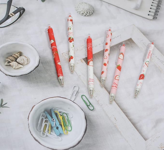 YYaaloa 12pcs Cute Strawberry Pens Black Gel Ink Pens Retractable 0.5mm Gel Pens Nice Gifts Fun Pens for Kids Girls Boys Christmas Gifts