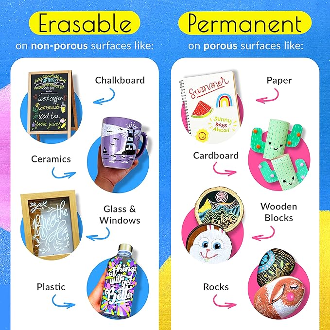 - Washable Markers | Comes Off Easy - The chalk markers for chalkboard will work on almost any surface! These chalk board markers will erase off non-porous surfaces such as glass & mirrors (dry & wet erase) & permanent on porous surfaces (like wood).