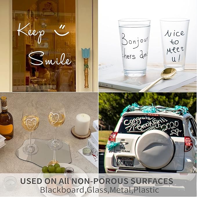 - ENDLESS POSSIBILITY-Used on any non-porous surfaces such as Car Windows, Menu Boards Cafe, Pub and Bistro Menus, Chalkboard Labels, Chalkboard Paper,Plastic, Metal, Wine Glass, House Windows,s, Glossy Boards, Mirrors, and much more