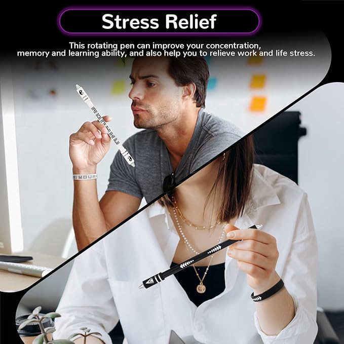 - 【Package and Size】You will get 2 pen spinner in different colors (without pen refill) and 2 silicone bracelets, black and white. Spinning pen length size: 8.5 inch / 21.5cm, suitable for beginners and enthusiasts.