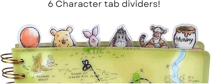 - VINYL COVER WITH 6 SEPARATORS - The protective vinyl cover is easy to wipe clean, and the Eeyore, Tigger, Piglet, Winnie, balloon, and Hunny Pot separators stick up from the top for easy flipping. Each section divider has a beautiful color illustration that looks just like the storybook pages.