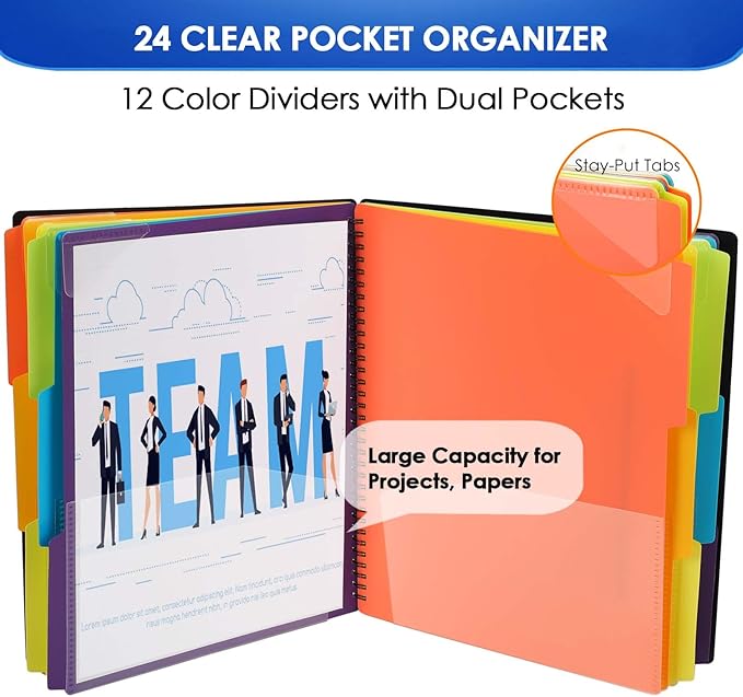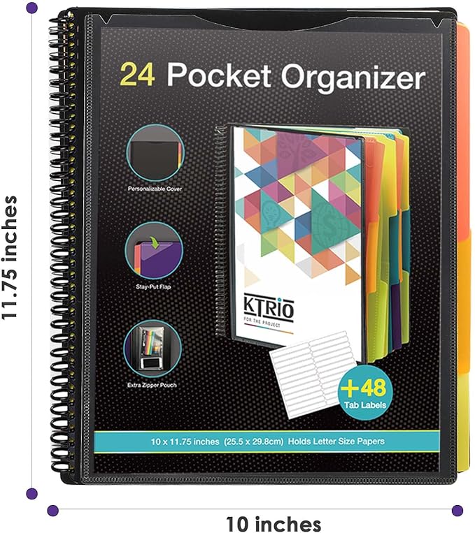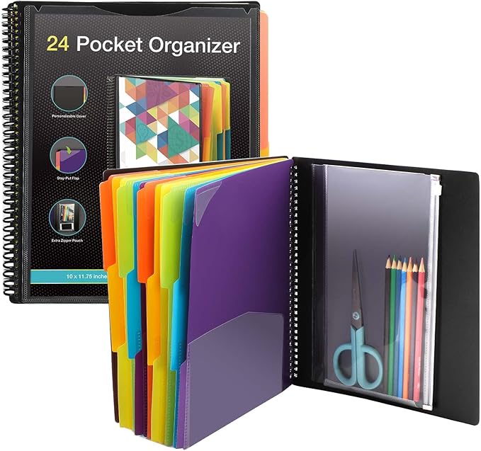 - Large Capacity Essential School Supplies- The binder organizer including 24 pocket folders, with 12 assorted dividers with 3/1-cut assorted tabs, 1 additional pocket on the front cover, 1 zip pouch on the inside back cover. Dimension: 11.8 x 10 inch.