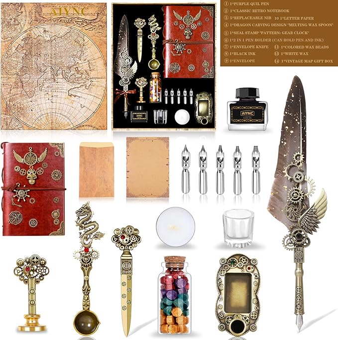- 【Quill Pen Ink Set Included】: 1* Quill Pen, 1* Notebook, 1* Ink(Black), 1* Seal Stamp, 1* Pen Holder, 5* Stainless Steel Nibs Of Different Sizes, 1* Wax Beads, 1* White Wax, 1* Spoon, 1* Cup, 1*1 Envelope Opening Tool, 1* Envelope and writing paper, 1*Beautiful Vintage Globe Design Box.The unique and beautiful punk mechanical gear design is a beautiful landscape no matter it is placed on the desk, coffee table or computer desk.