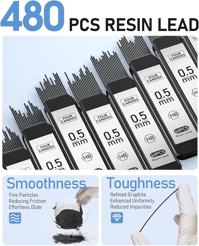 - 480PCS Resin Lead: 8 tubes of 60pcs super capacity leads; The stronger resin lead which doesn’t require sharpening and is not easy to break, provides ultra-smooth writing and clear dark lines