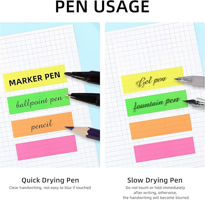 - [WRITABLE AND POSITIONABLE] The label is half self-adhesive, and can be repositioned for easy pasting and marking, and clean up. Different pens bring different effects to the sticky notes, (easy-dry pens: ballpoint pens, pencils, markers; difficult-to-dry pens: fountain pens, gel pens, ink-based pens, etc).