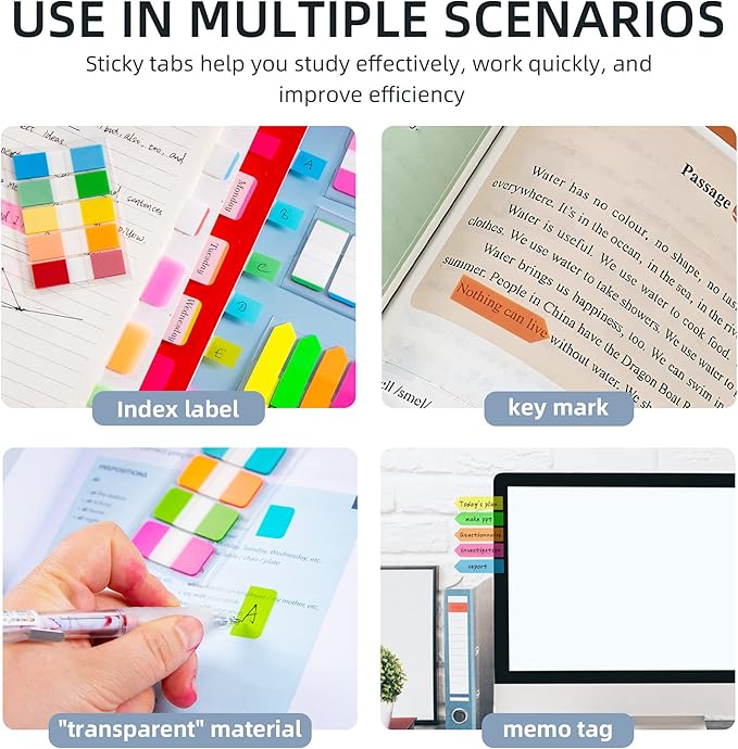 - [WIDE APPLICATION] Fluorescent translucent book sticky tabs can be used to classify and mark documents, computer message boards, reading notes, books, folders, diaries, catalogs, archives, files, and papers, and are very suitable for students, teachers, and office workers.