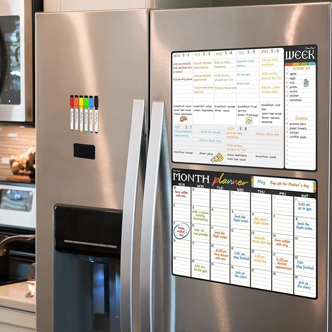 Magnetic Dry Erase Monthly and Weekly Calendar - 17"x12" Monthly and Weekly Whiteboard for Fridge - 6 Extra Fine Point Markers Included - Shipped Flat