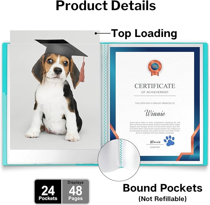 - Art Binder Portfolio: Portfolio photo album with 24 bound (non-refillable) pockets, displays 48 viewable pages. Custom spine insert to organize and display artwork with ease.