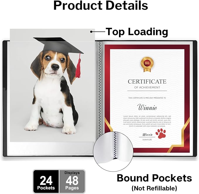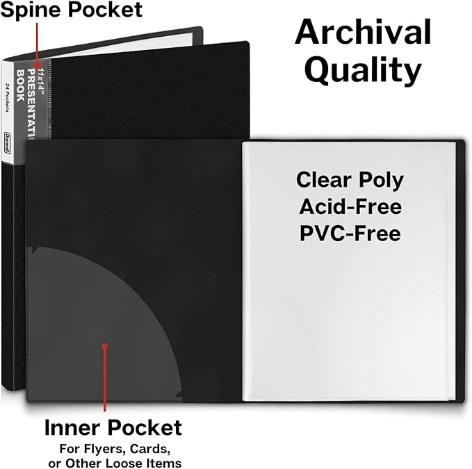 - Art Binder Portfolio: Portfolio photo album with 24 bound (non-refillable) pockets, displays 48 viewable pages. Custom spine insert to organize and display artwork with ease.