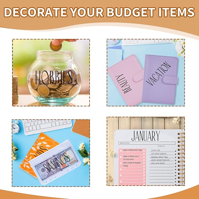 - RELIABLE VINYL DECAL MATERIAL: The cash envelope labels for money saving binder are preprinted on water-resistant, transparent vinyl with a self-adhesive backing that resists peeling and tearing, just remove or replace the stickers on cash envelope wallet as needed. Stickers are easy to apply and durable for long time use.