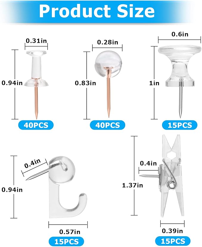 - 5 styles 125 counts push pins in a case. giant clear thumb tacks * 15-count, clear push pin hooks* 15-count, clear push pin clips* 15-count, rosegold map tacks*40-count, rosegold thumbtacks*40-count