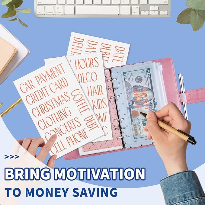 - GET ORGANIZED & PRETTY GIFTS: OOUUREC Planner Label Stickers intend to give your office organizer a sense of inspiration, help simplify cash stuffing envelopes and get a6 binder or zipper pocket organized. The budget labels for savings binder is ideal gift for women to personalize cash wallet budget system, realize financial goals by enjoying the budgeting process.