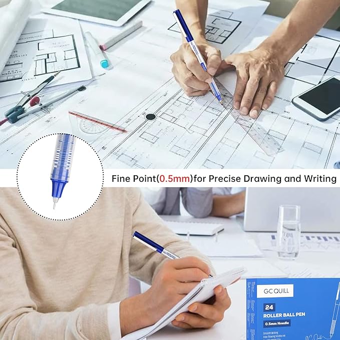 GC QUILL 48 Rollerball Pens 0.5mm Needle Point Black Liquid Ink Pens 24 and Blue Liquid Ink Pens 24 for Bullet Journaling, Office Supplies for Writing, Taking Notes & Sketching BKL48