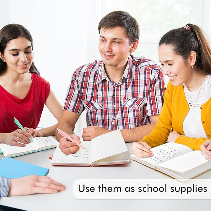 - 5 different mild colors for these notebooks. There are 5 Black Retractable Pens in the box. You can use it as soon as you receive it. These pens are perfect to be put in the pen holder of the classic ruled notebook. Large tube has the capacity of restoring more ink, which makes them long lasting. Quick drying can avoid smearing and smudge.