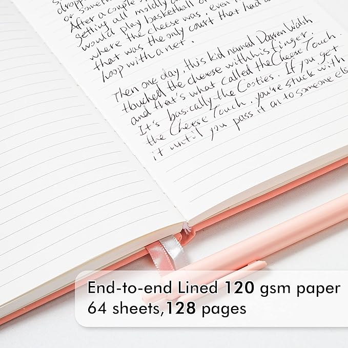 - These classic ruled notebooks are all blank inside with 128 lined pages (64 sheets), which would be convenient for daily usage. The hard cover journal has a water-resistant faux leather cover, round corners and bookmarks, which is designed to lay and open flat. There’s a “date/page” column on the top of every page. You can use it as a reminder to let you remember those important dates and find the page you want in a very short time.