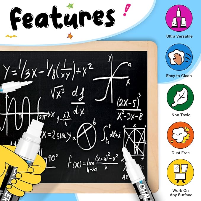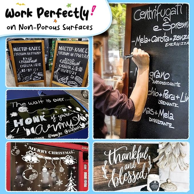 - 【Easy to Use and Clean】Shake your white chalkboard markers 15-20 times and then press the white chalk marker's nib down for a few times until chalk marker's Ink flows before use chalk paint markers on glass, chalkboard, cars window or any non-porous surfaces. This erasable chalk pen super easy to clean off with a damp cloth from most non-porous surfaces.