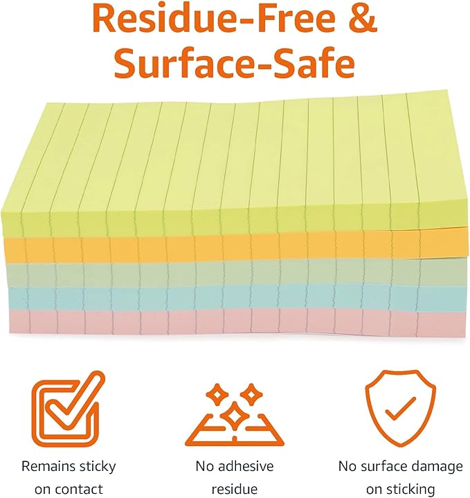 Amazon Basics Sticky Note Pads, Lined, 4x6, Rectangular, Assorted Colors, Pack of 5