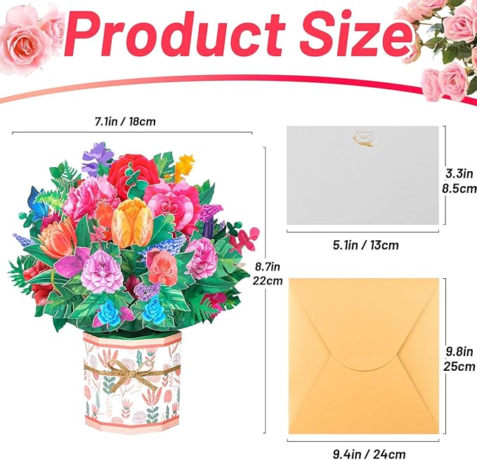 - What You Will Get: 3d pop up card set contains a flower bouquet card, an envelope, and a blank note card that allows you to for showing your sincere appreciation to those special people in your life