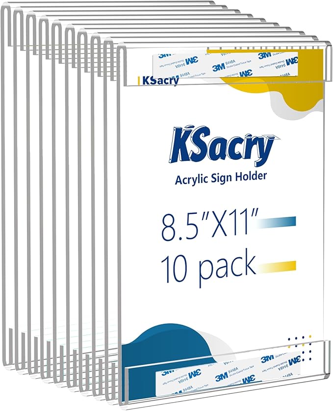 10 Pcs Acrylic Sign Holder 8.5 x 11, Vertical Wall Mount Sign Holders with 3M Adhesive, Clear Plastic Frames Paper Display Sign Holders for Office, Home, Store, Restaurant - No Drilling