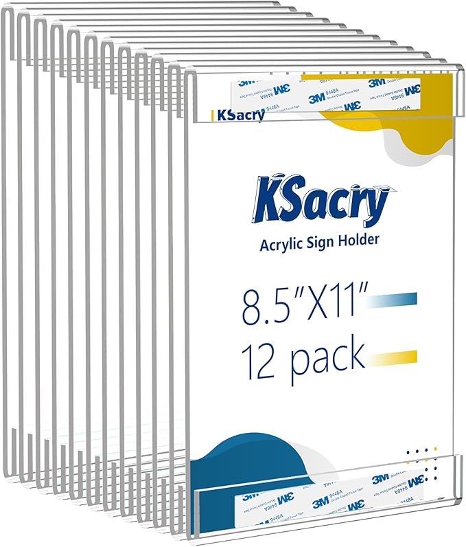 12 Pcs Acrylic Sign Holder 8.5 x 11, Vertical Wall Mount Sign Holders with 3M Adhesive, Clear Plastic Frames Paper Display Sign Holders for Office, Home, Store, Restaurant - No Drilling