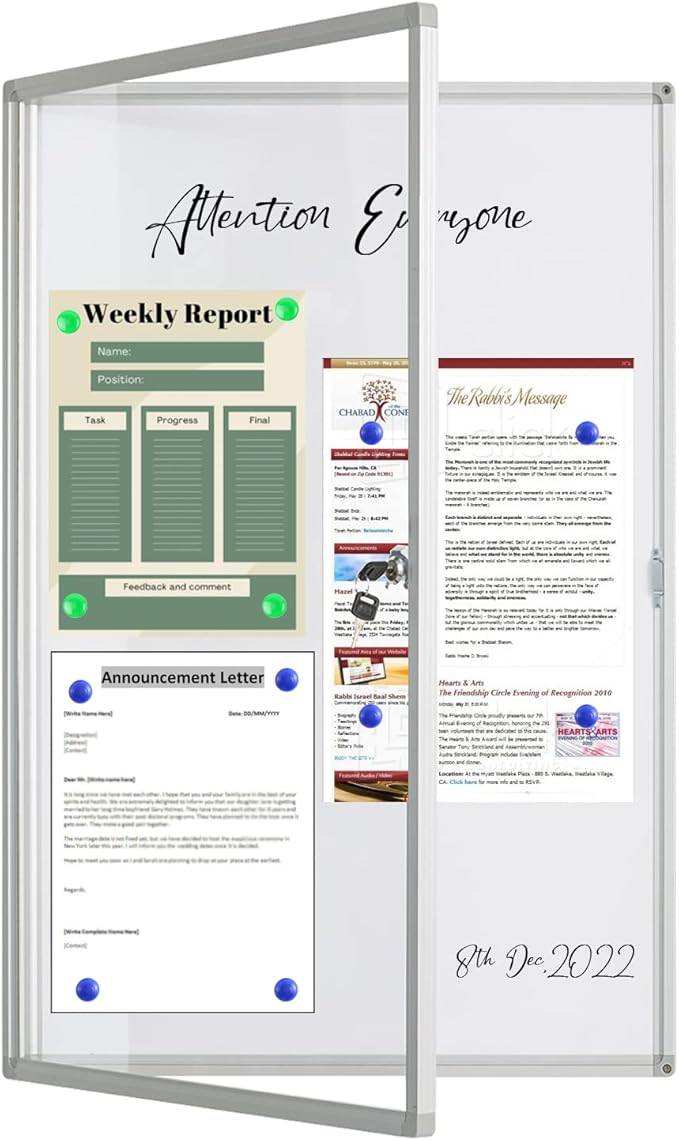 - 3. 🧪【Magnetic Dry Erase System】 Tamperproof dual-locking door safeguards sensitive information. Crystal-clear acrylic door allows marker writing directly on its surface, while the inner magnetic whiteboard accepts dry erase markers or pushpins for versatile use.
