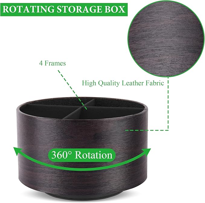 Hennaja Round Leather Art Supply Organizer,Remote Control Holder,360 Degree Spinning,Multi-Functional Pencil Holder,4 Compartments Desktop Stationary Organizer(1-Dark Brown2)
