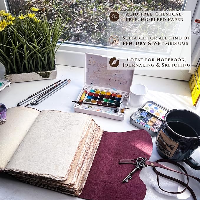 - VINTAGE DECKLE PAPER: Elevate your writing experience with this Leather-Bound Journal, showcasing 200 Pages (Both Sides) 125 GSM thick Virgin Cotton Handmade Deckle Edge watercolor Paper. This paper is an impeccable canvas for both dry and wet mediums.