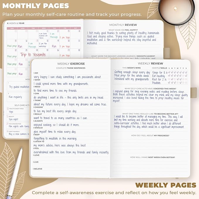 - BUILD A HAPPIER & HEALTHIER MINDSET FOR YEARS TO COME: This self care notebook is filled with prompts, open-ended questions, wellness trackers, and many other tools to help you pinpoint the changes you can make to improve your well-being.
