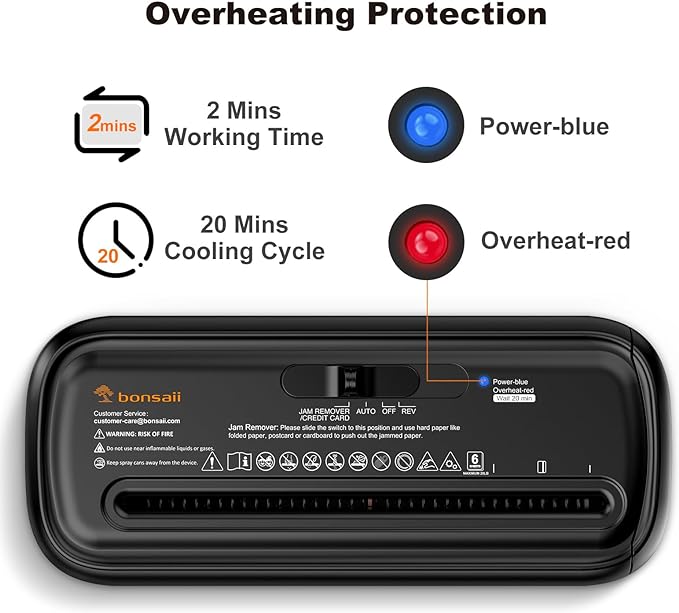 - Overheating Protection: Upgraded overheat warning protection auto start, when the red light is on, the shredder stops working and then needs a 20-minute cool-down, makes shredding machine be more safe while using it.