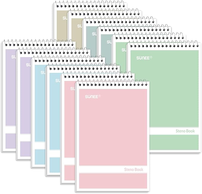 SUNEE 12 Pack Steno Pads 6x9, Gregg Rule, 60 Sheets, 6 Assorted Color Spiral Notebook 6x9, White Paper, Take Notes with Top Spiral Notebook, for School, University, College, Work, Office