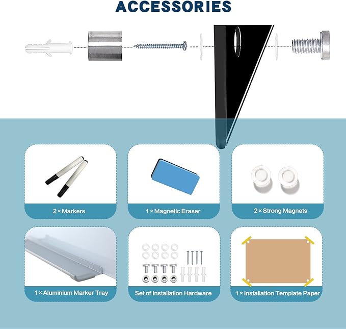 - Easy to Install: Glass Whiteboard Magnetic Dry Erase White Board is easy to install. Through the assembly instructions provided by us, you can easily install the whiteboard vertically or horizontally on the wall, with a magnetic glass dry erase board and a pen tray.Dry Erase Glass Magnetic White Board can be mounted vertically or horizontally to fit your space.