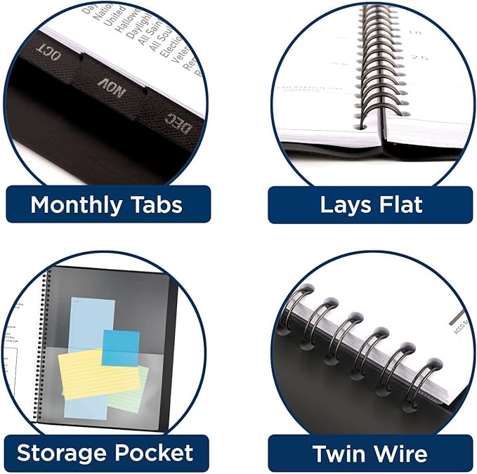 - MODERN STYLE – Add a touch of professionalism to your daily routine. The planner features a durable Black cover with foil accents and twin wire binding that prevents snags and secures pages