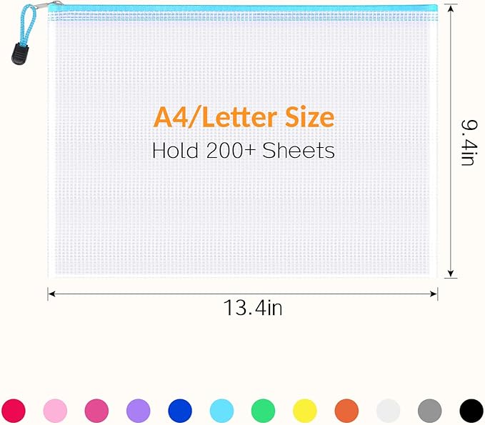 Sooez 24 Pack Mesh Zipper Pouch with Sticky Labels, A4 Size Mesh Bags for Board Game & Puzzles Organizing Storage, Durable Letter Size File Bags for Office Classroom Organization, 12 Assorted Colors