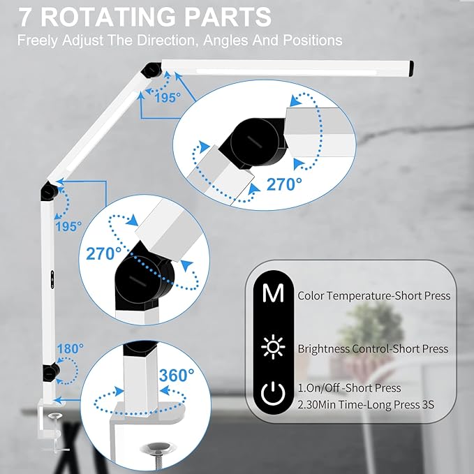 - 【7 Rotating Parts】The office lamp body has 7 rotatable parts, which can be freely adjust the direction, angles and positions(you can check our videos for details), and can be clipped to various scenes such as desktops, bookshelves, sofa sideboards, shelves, and bedheads.
