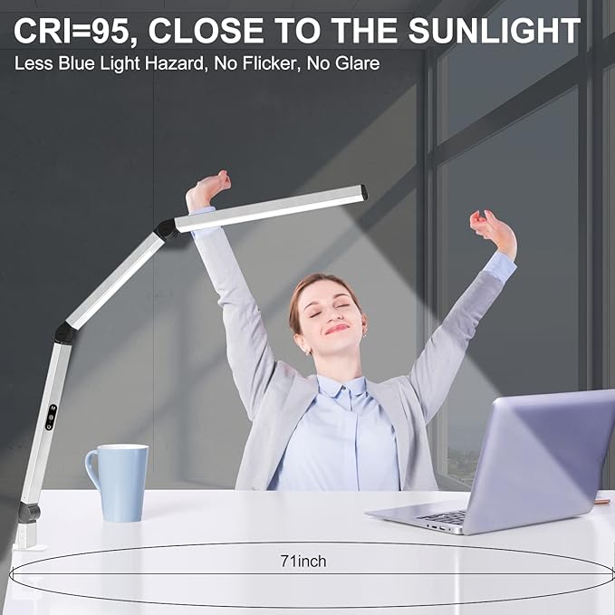 - 【Dual Light Source Design, CRI=95】Micomlan swing arms led desk light with dual light source, which can evenly illuminate the entire desktop workbench. The desk lamp offers a nature and soft light colse to the sunlight, CRI=95. No flicker, no glare, less blue light hazard. You won't get tired with prolonged use.