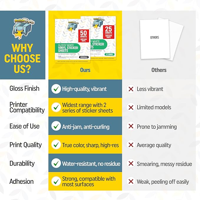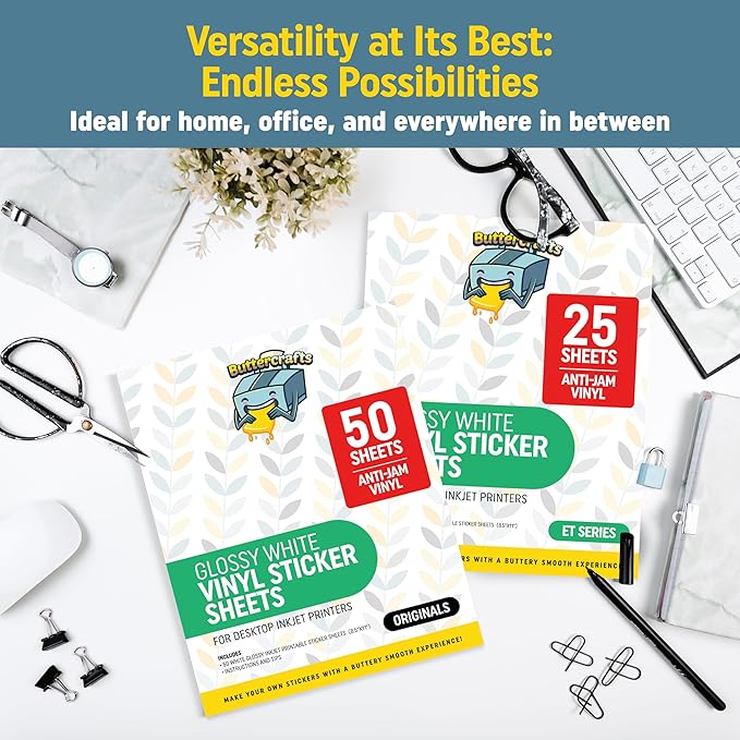 - BUTTERCRAFTS PREMIUM PRINTABLE STICKER PAPER - 50 Sheets / 8.5x11 / White Glossy Sticker Paper / Sticky Permanent Adhesive / Unbranded Backing Sheet / Works with most cutting machines