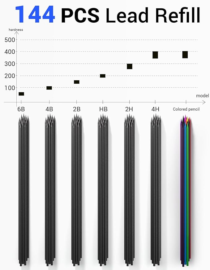 - Value Mechanical Pencils Set: Come with 3pcs sketch pencils 2.0 mm, 12 tubes lead refill (total 144pcs, 24x HB, 24x2H, 24x2B, 24x4B, 24x CR, 12x4H, 12x6B), 3pcs eraser, 2pcs handhold sharpener, 1 gift plastic box