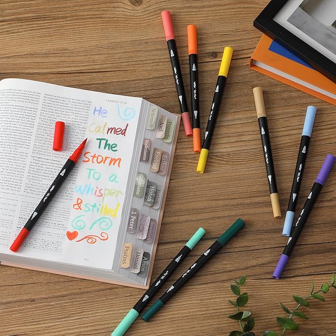 - Enjoy a wide spectrum of color with these dual-tip brush pens, perfect for artistic creations, calligraphy, coloring, and more, with each color designed to stand out vividly on any page.