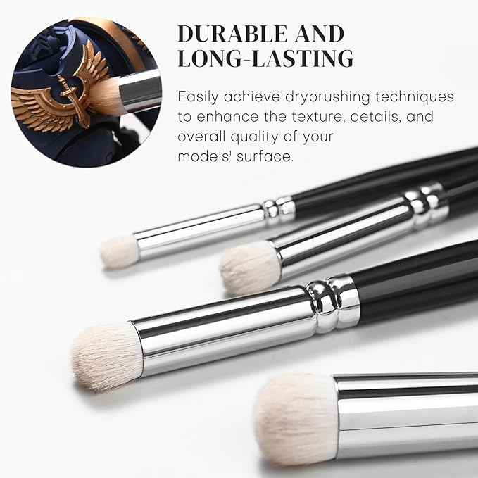 - Premium Goat Hair Drybrushes: Our goat bristles dry brush with dense, semi-stiff, and springy, is designed for model painting, can help artists and model makers easily achieve drybrushing techniques, enhancing the texture, pattern, and detail effects on model surfaces, also for other painting techniques such as drybrushing edges, drybrushing highlights, drybrushing textures, and more. With 3 different sizes can be used for different painting techniques and areas of drybrushing.