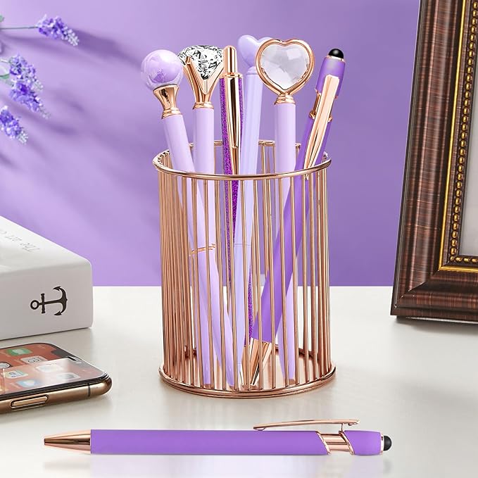 - 【Purple Ballpoint Pen Set】 Set of 6 purple ballpoint nice pens design for different styles. It includes a diamond pen, a heart shaped diamond pen with crystal, a pearl pen, a heart shaped metal pen, a glitter pen and a stylus pen .The variegated design can satisfy your difference usage scenarios and demands.