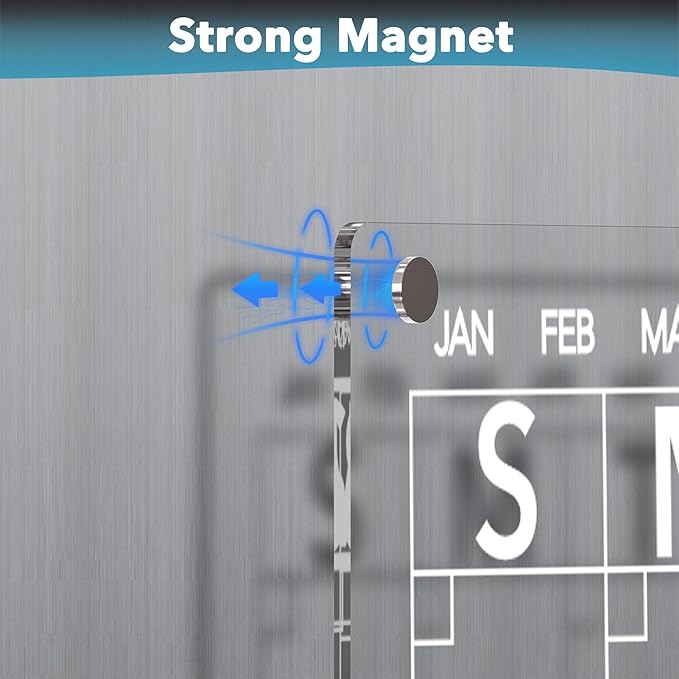 - Strong Magnet: 4 pcs strong 0.12 in extra-thick magnets enable the acrylic calendar to stick firmly to the fridge even when you slam the fridge door.This erasable board will never slide down or damage your refrigerator. Note: Not suitable for stainless steel surfaces.