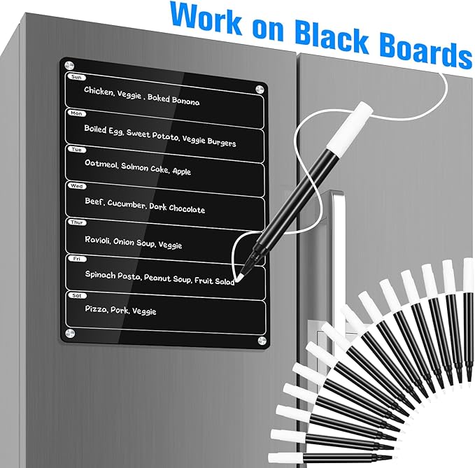 - Easy to Read on Black or Dark Background. 14 white erasable wet liquid chalk markers are visible on black glass board, black acrylic calendar planning board, black menu board for kitchen, black meal planner, black coffee sign, black chore chart board.