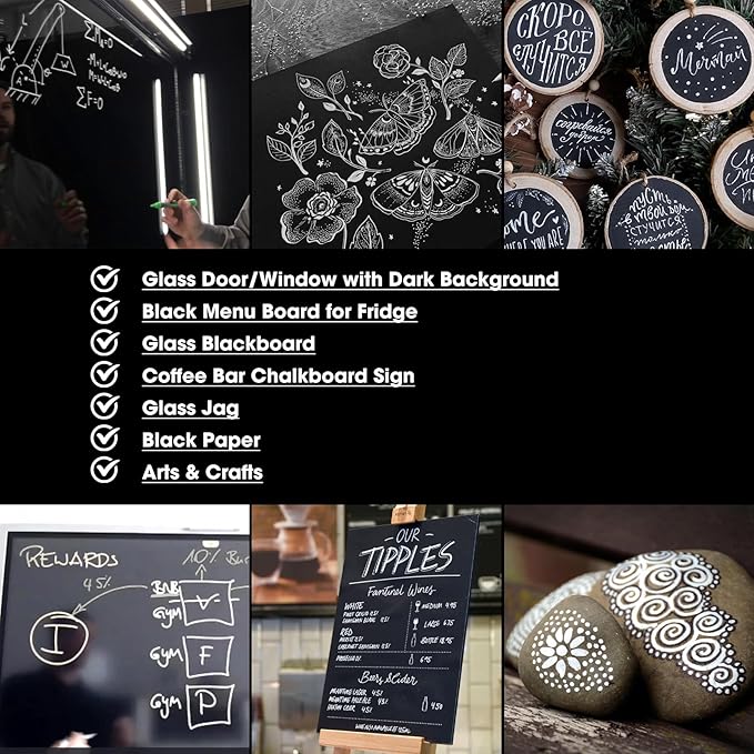 - Write Smoothly on Many Dark Surfaces. These liquid chalk markers with 1mm (0.04 inches) fine points work great on black and smooth surfaces including acrylic writing board, black glass writing board, black glass window, black car windshield, mirror, office glass door, allowing you to write on many smooth reusable surfaces instead of writing on paper.