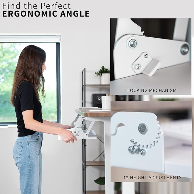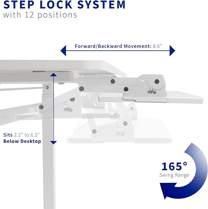 - Height Adjustment - Adjust the distance between your tray and the desktop (2.2" to 6.5") with the simple 12-step locking system. This encourages ergonomic posture and accommodates thicker table tops.