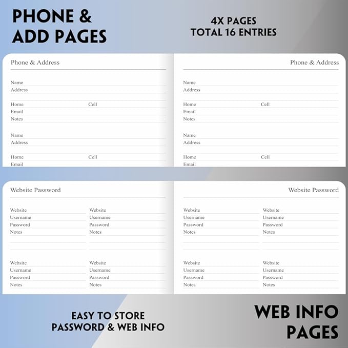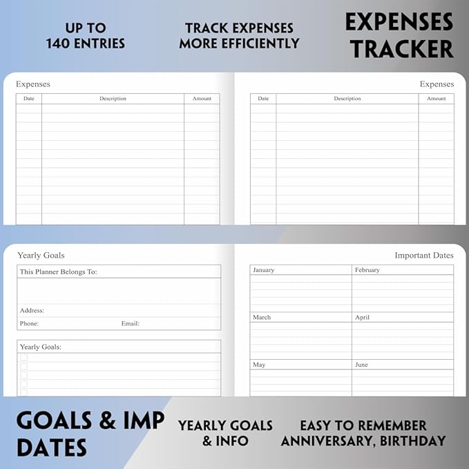 - Major holidays listed, yearly goals, important date pages, website password, address, expense, and notes pages