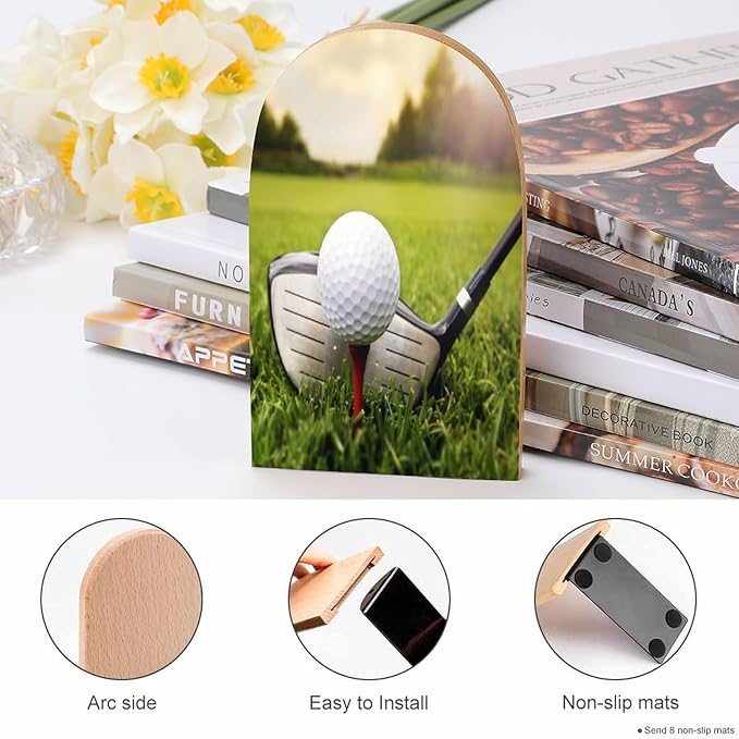 2 Pack Wood Bookends, Sport Golf in Grass Non-Skid Book Ends for Heave Books, Decorative Bookends for Shelves Desk, Book Stoppers Book Holders for Home Office Library School