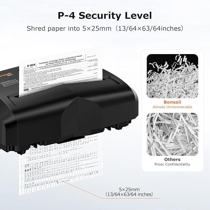 - [Jam Proof & Easy to Operate]bonsaii paper shredder has auto start/stop and manual reverse functions, which helps you clean up paper jams easily or when shred a useful file mistakenly, you can push to "REV" to reverse the paper.