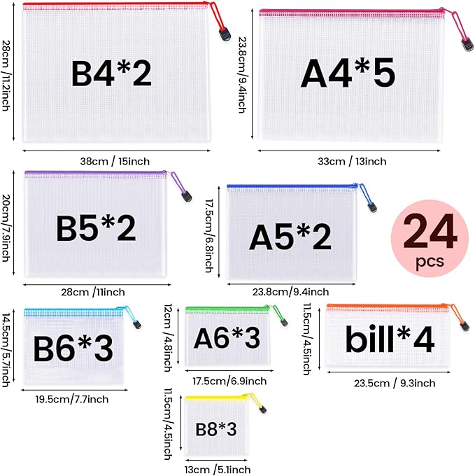 - Multiple sizes:24pcs zipper organizer bags in 8 different sizes and 8 colors, 2*B4(Red), 5*A4(Rose Red), 2*B5(Purple) , 2*A5(Blue), 3*B6(Light Blue), 3*A6(Green), 4*Bills(Orange), 3*B8(Yellow), Get organized with our range of mesh zipper pouches, perfect for pencil pouches, travel pouches, clear storage bags. Available in multiple sizes, these durable and transparent plastic zipper bags will keep your belongings tidy and accessible