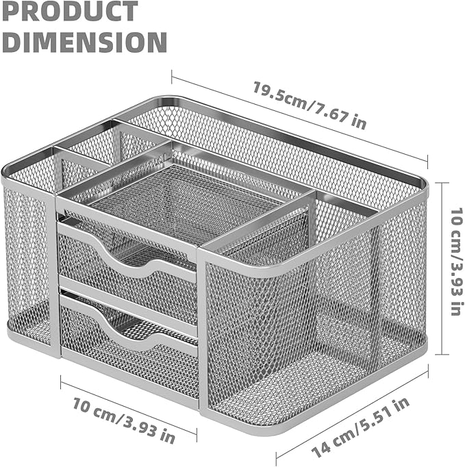 Marbrasse Mesh Desk Organizer, Pen Organizer with 2 Drawer, Multi-Functional Pencil Holder for Desk, Desk Organizers and Accessories with 5 Compartments + Drawer for Office Art Supplies (Silver)